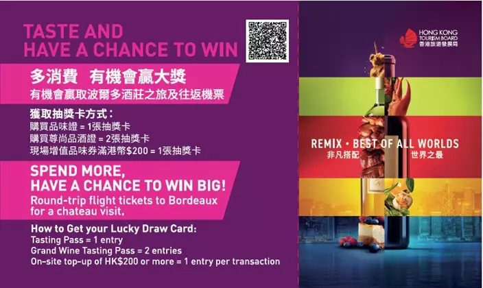 凡購買品味證或於現場增值品味券滿港幣$200,即可獲 1張抽獎卡;購買尊尚品酒證,則可獲得 2張抽獎卡,買得越多,抽獎機會越多!有機會贏取波爾多酒莊之旅住宿連來回機票(共四位幸運兒,每份獎品價值港幣5萬元)*,展開一場波爾多夢幻品酒之旅。