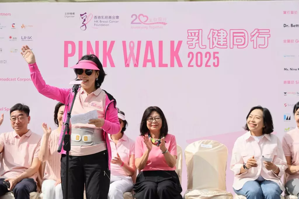 香港乳癌基金會主席霍何綺華博士致歡迎辭時,不忘提醒各位婦女定期接受乳健檢查。霍博士表示:「在今個粉紅十月,基金會喜獲逾30個機構支持,推出一連串慈善籌款活動,與基金會攜手對抗乳癌。」霍博士表示,感謝各大贊助商、支持機構、媒體夥伙、義工隊,令「乳健同行2025」得以順利舉行,籌得的善款將成為基金會的動力,展望未來大家繼續與基金會攜手,支持乳癌患者、康復者及其家人。家燕姐、廖碧兒、朱千雪分別以基金會大使身份作出呼籲,家燕姐與廖碧兒多年來一直支持「乳健同行」,原因既可以做運動,又可以做善事,幫助乳癌社群,並提醒大家在活動過後,要繼續支持基金會的工作。而連續第二年現身支持「乳健同行2025」的朱千雪表示,見到近二千粉紅健兒共聚山頂,場面好震撼,大家都抱著共同信念支持乳癌患者及推廣乳健資訊,很令人感動。