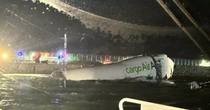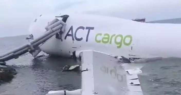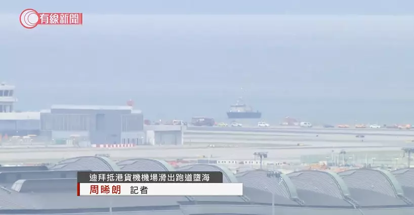 杜拜來港貨機降落時衝出跑道撞地勤車後墮海,兩地勤死亡。有線新聞影片截圖