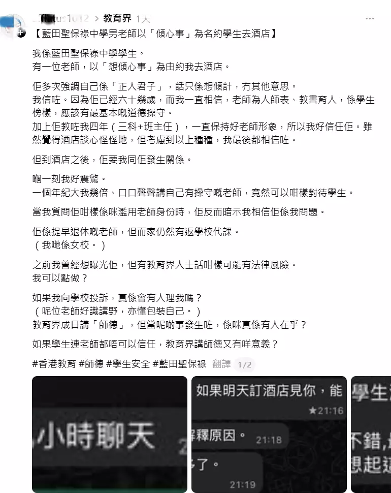 網上有聲稱是藍田一間中學的學生表示,曾經被該校老師邀約酒店「發生關係」。網上截圖