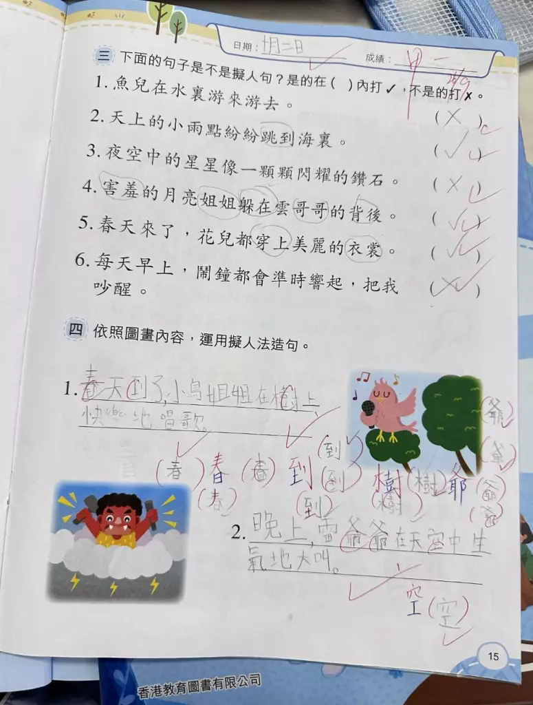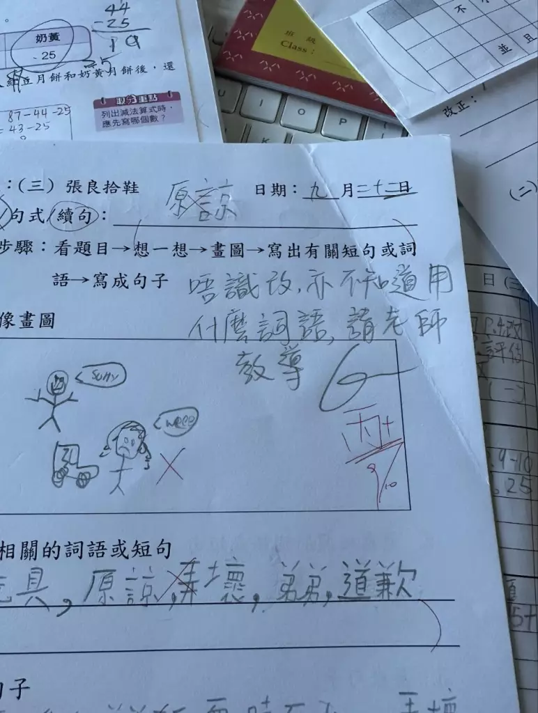 另一張看圖造句及供詞續寫工作紙上,孩子僅獲「丙+」評分,家長疑似無從入手協助,最終在紙上寫下「唔識改,亦不知道用什麼詞語,請老師教導」。