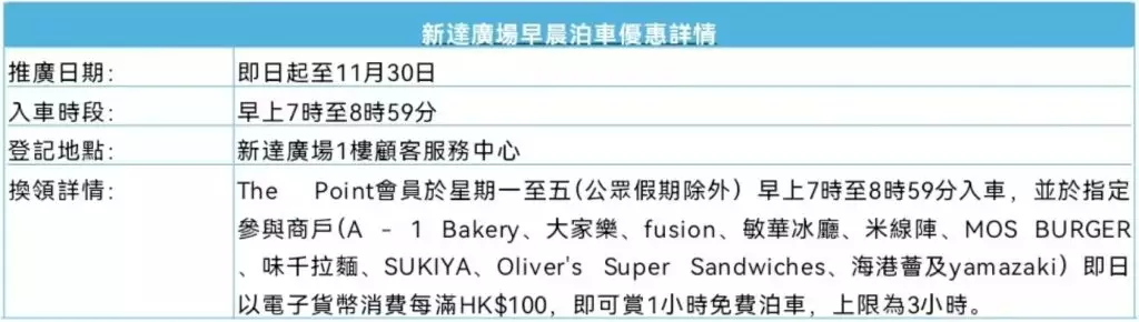一日之計在於晨,新達廣場由即日起至11月30日推出「早晨泊車優惠」讓你更輕鬆!
