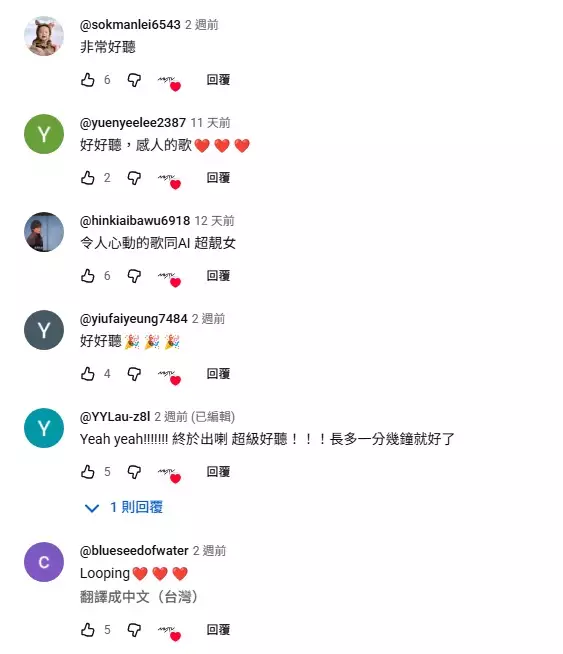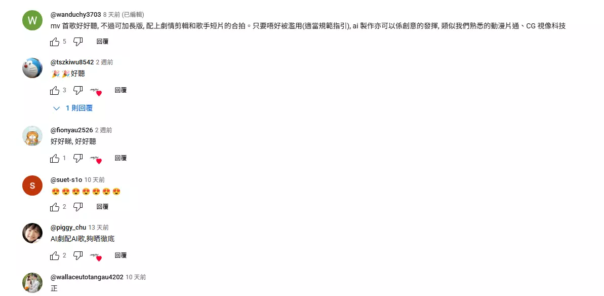 至於早前播映完畢的首部AI生成青春校園愛情短劇《在我心中,你是獨一無二》,三位AI男女演員鄭柏然(Owen)、曾子悠(Luna)及何灝瀧(Hugo)目前各有發展。Luna同Hugo已開設個人 IG 賬戶、個人簡介,還有童年開始的成長軌跡照片,拉近跟網民的距離。二人的螢幕情侶形象,已深入民心大獲網民支持。Luna主唱的主題曲《秘密的季節》在YouTube大受歡迎,上架半個月觀看數已超過24萬次,更有不少留言支持,有網民表示︰在我心中,子悠是獨一無二、聽完一次就好想無限loop勁上腦、令人心動的歌同AI 超靚女。