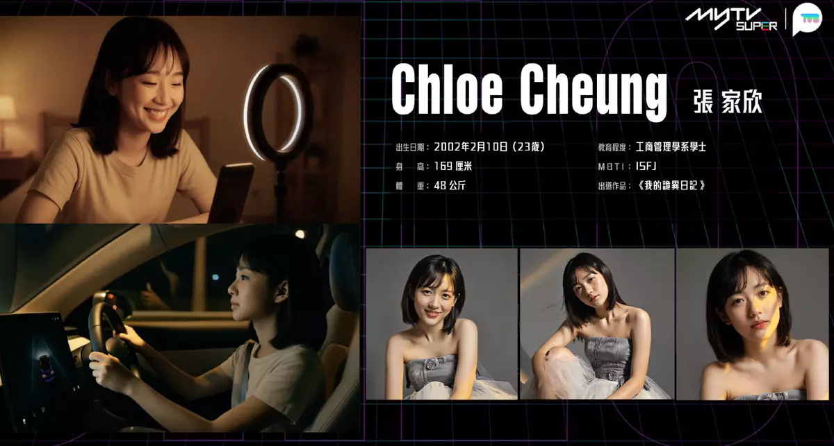 AI生成靈異微短劇《AI930︰A.I.靈接觸》,逢周一晚9點半及周二晚9點35分於TVB Plus(82台)熱播中。早前宣傳「請來」AI梁思浩及真‧思浩協助,成績有目共睹。劇中女主角張家欣(Chloe),已成為網民追捧對象。