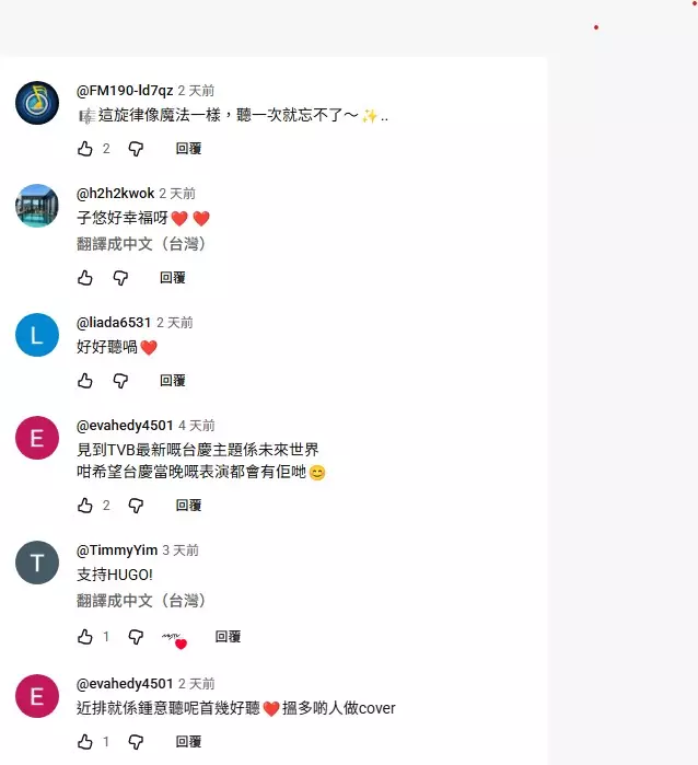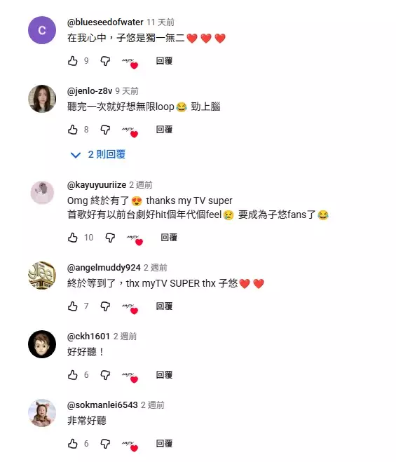 Hugo主唱與劇集同名的插曲《在我心中,你是獨一無二》更厲害,短短10日觀看數已超過28萬次,網民留言更直接表示︰子悠好幸福呀、支持HUGO、好聽好感動。二人的觀看數目已超逾52萬次,成績非常驕人。看來Owen跟新人Chloe要急起直追。