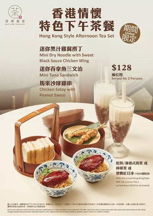 奇華茶室全新配搭的「香港情懷特色下午茶餐」,以港式美食展現香港的經典飲食文化。二人套餐定價為港幣128元正 (另加一服務費),包含以下精選菜式: