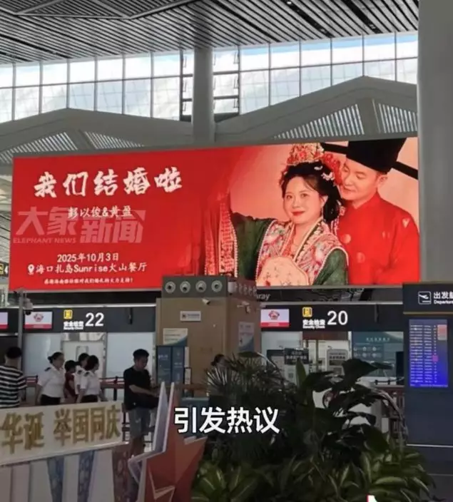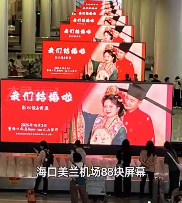 綜合內媒報導,海南海口美蘭機場近日出現一則極具話題性的「婚禮邀請函投放廣告」,一對新人的婚禮邀請函在機場88塊電子螢幕上同步播放,從登機口的直立螢幕到出發大廳的大螢幕,已連續播放8天,成為旅客間熱議的焦點。來自海南的新娘黃女士表示,此舉是希望「把幸福分享給所有路過旅客」的一次浪漫嘗試。