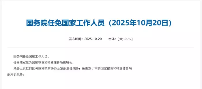 另外,任命陳軍生為國家糧食和物資儲備局副局長,免去劉小南的相關職務。