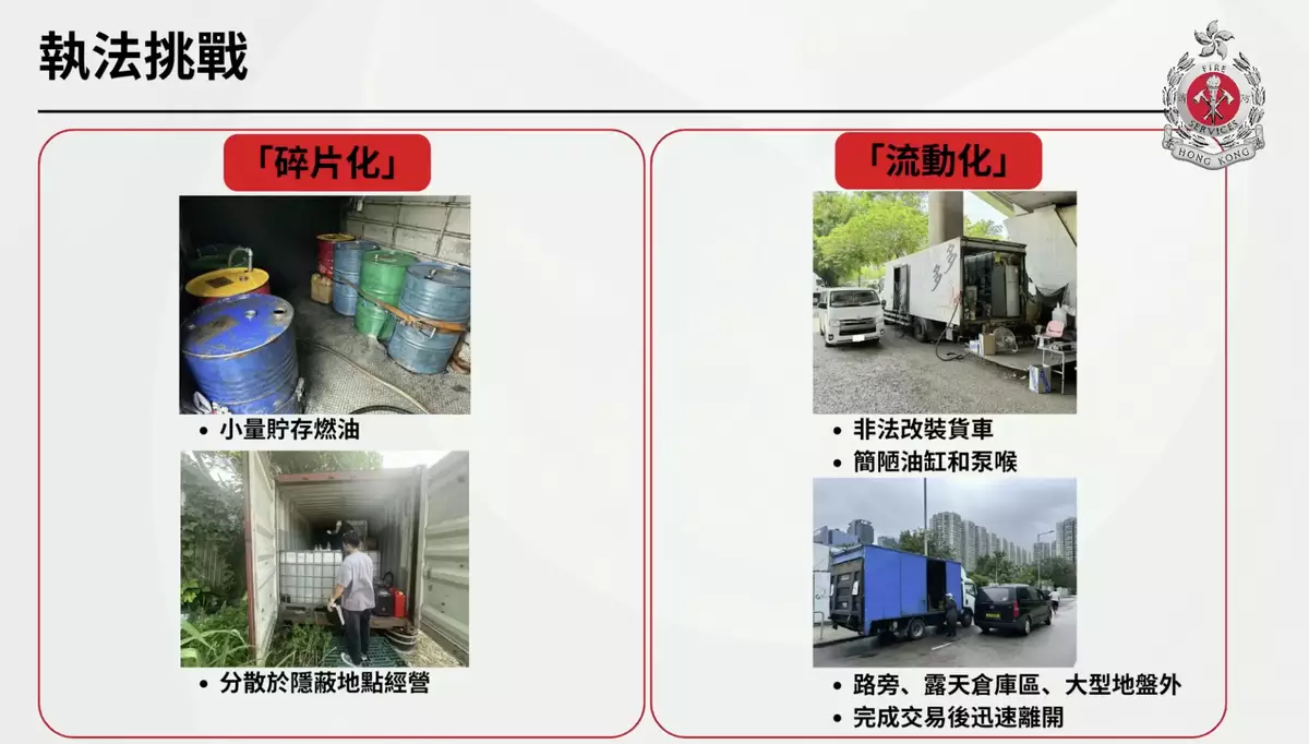 消防處9月至今展開打擊非法燃油轉注的執法行動,進行349次巡邏,截獲22萬公升柴油,市值600萬元,搗破23個非法油站,提出47宗檢控。