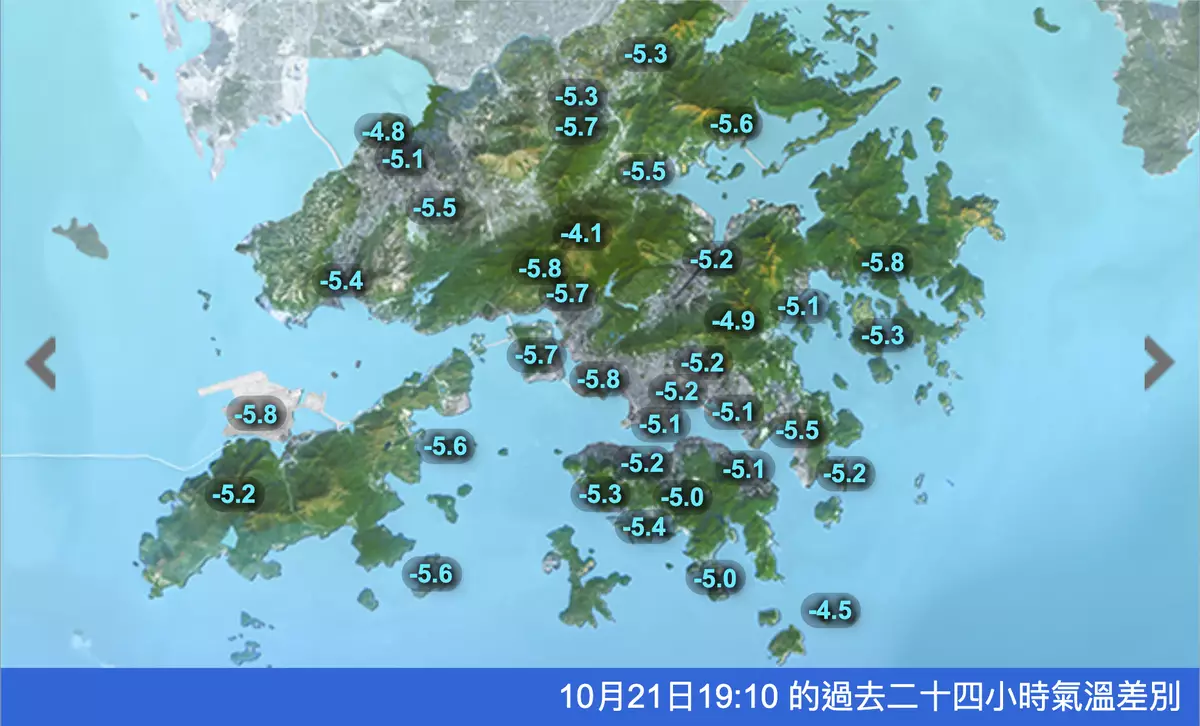 受風神的外圍雨帶及東北季候風影響,本港氣溫正逐步下降,星期三早市區最低氣溫約19度,新界再低兩三度。日間最高氣溫約22度。