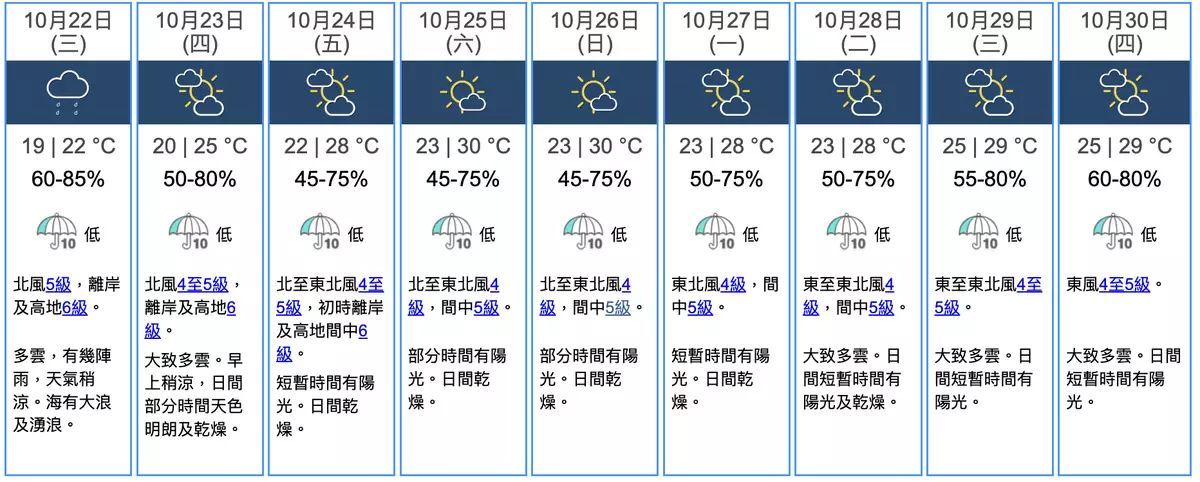 天文台指,展望星期四風勢仍然較大,日間天色好轉,氣溫回升,晚上部分沿岸低窪地區可能出現水浸。隨後兩三日部分時間有陽光,日間乾燥。