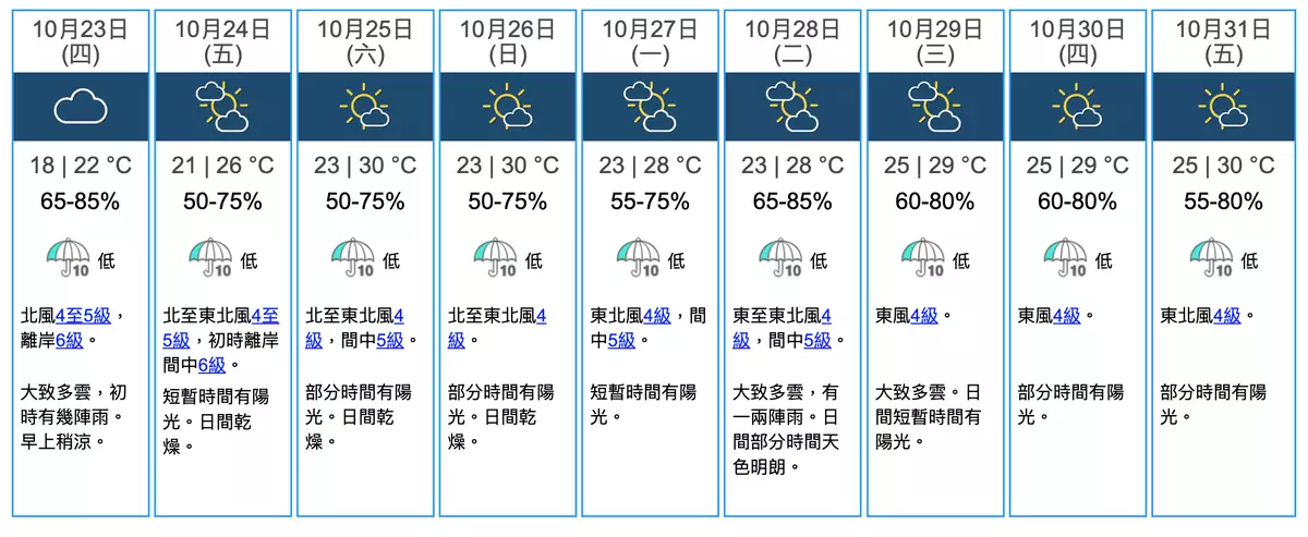 展望晚上及周四早上稍涼,市區最低氣溫約18度,新界再低一兩度,日間最高氣溫約22度,吹和緩至清勁北風,離岸吹強風,隨後兩三日部分時間有陽光,日間乾燥,氣溫回升。