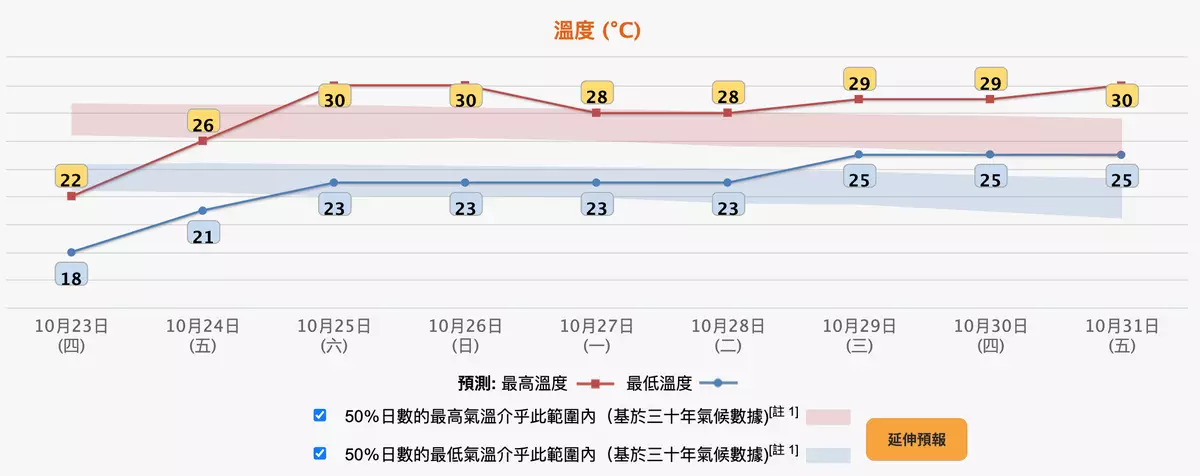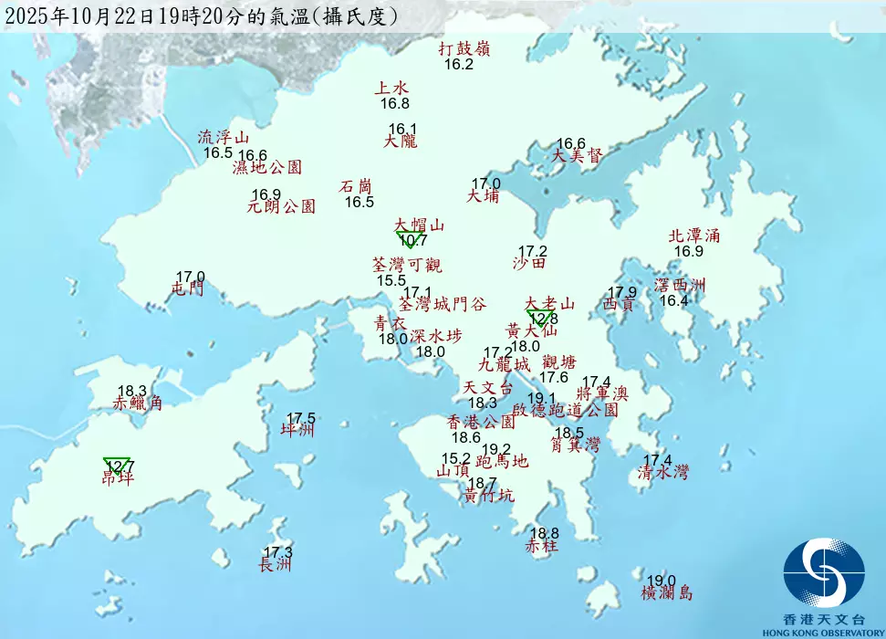 天文台表示,下午大部分地區氣溫較21日低3至4度左右。天文台總部氣溫,由21日日間約24度逐步降至22日早上最低18.4度,是25年入秋以來的最低記錄。