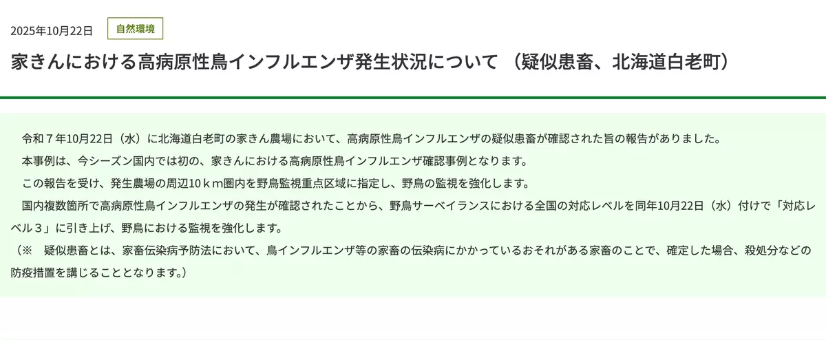 農林水產省在公報中表示,北海道相關部門21日接到白老町一個飼養了超過45萬隻蛋雞的農場報告,指出雞隻的死亡數量增加,禽流感簡易檢測結果呈陽性,今日經基因檢測確認這個農場的雞感染了高致病性禽流感病毒。