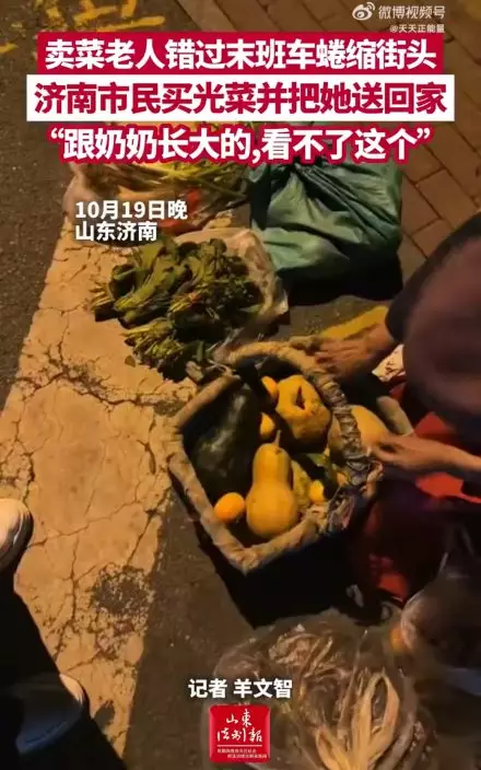 山東一名賣菜婆婆深夜錯過末班車蜷縮街頭,幸遇好心市民買走所有蔬果,還護送回家。