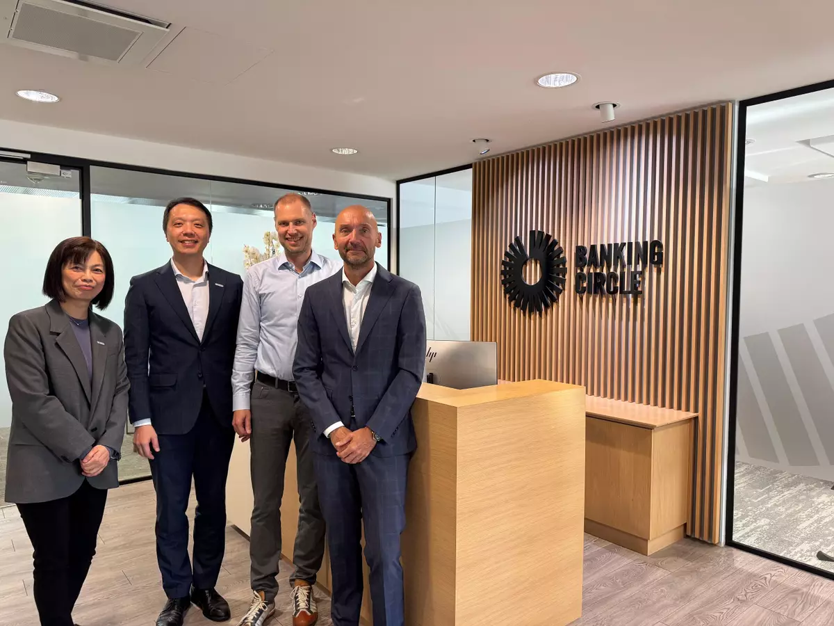 任景信(右三)及引進辦執行總裁彭文俊(左一)與該企業的代表合照。政府新聞處圖片