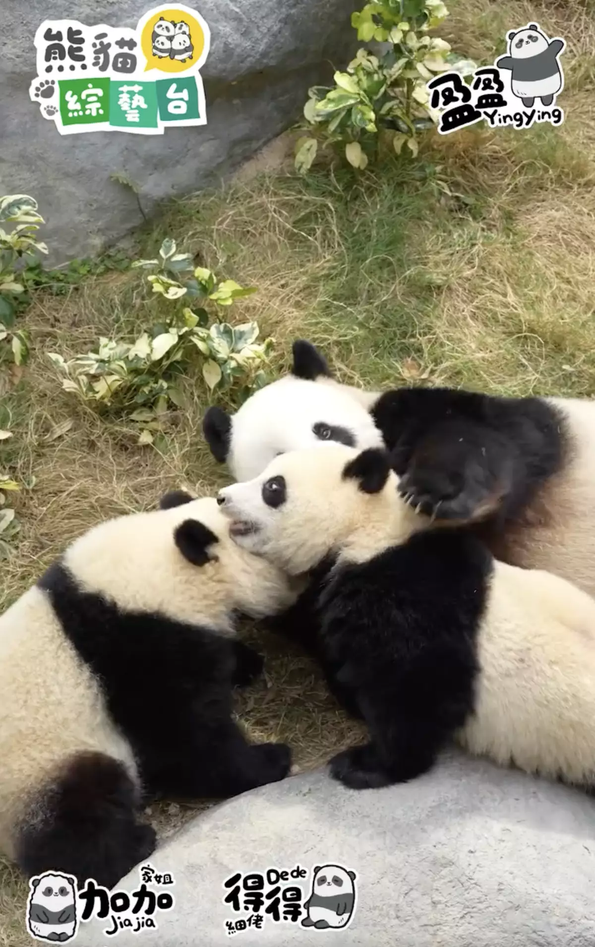 雖然盈盈已為人母,但玩起上來一點不遜於兩隻小熊貓,牠們堆在一起,兩隻小熊貓不停你咬我、我咬你,盈盈亦力入戰團,這個咬一口那個咬一口,惹得兩小隻埋頭反攻。