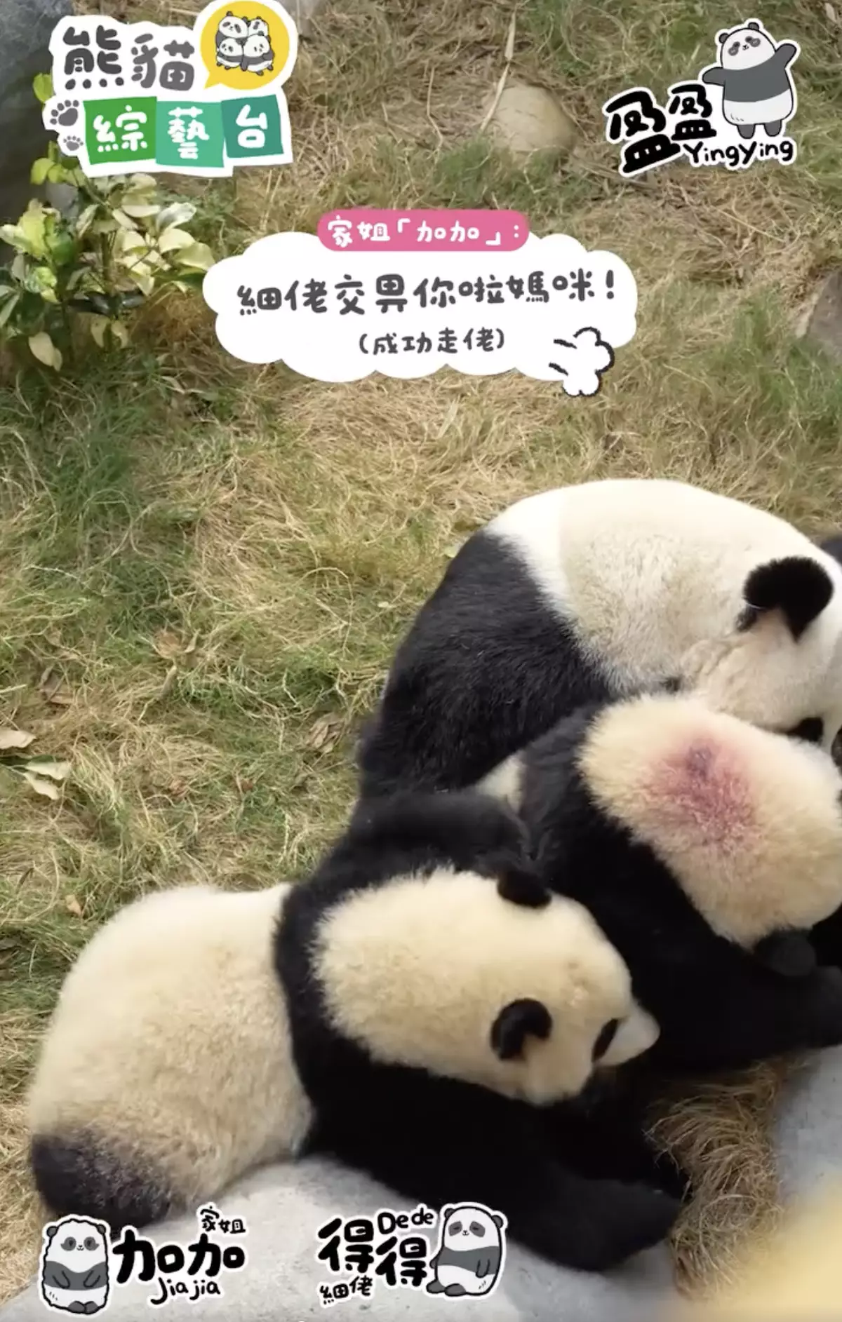 海洋公園的香港大熊貓官方專頁最新帖文帶來好消息,家姐細佬有不少成就解鎖,例如接受護理訓練,奶媽吹著哨子,加上手指指示,細佬就懂得朝奶媽方向走去,準備飲盆盆奶;又例如奶媽叫「加加」,家姐聽懂自己被點名,就馬上「應機」,聽明白指示自己走去正確的地方。