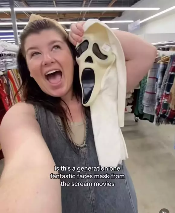 婦人花5美元買二手鬼臉面具意外買到《奪命狂呼》稀有原版,轉買淨賺逾600美元。影片截圖