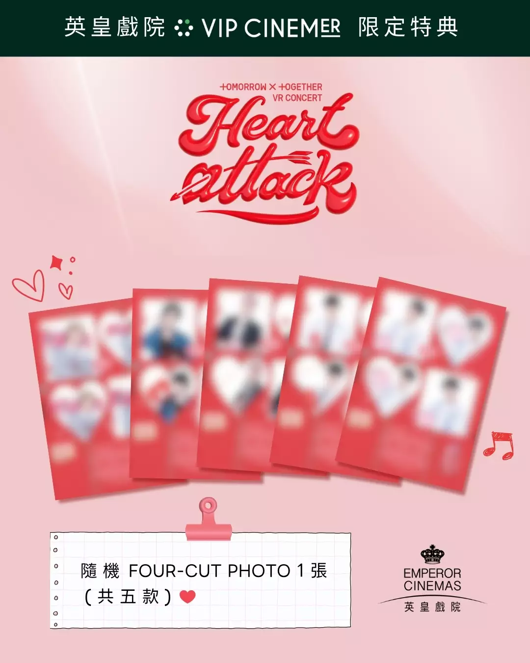 英皇戲院VIP CINEMER會員尊享額外禮遇:凡以VIP CINEMER身份購買VR演唱會門票,並於英皇戲院網站上載門票QR CODE,即可獲得一張「隨機FOUR-CUT PHOTO」(共五款),專屬收藏,絕對不容錯過!