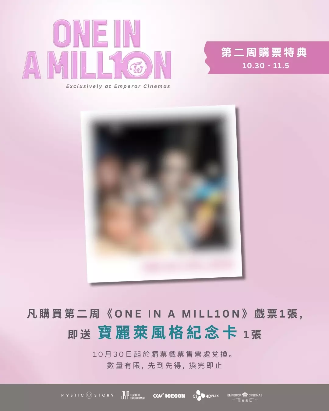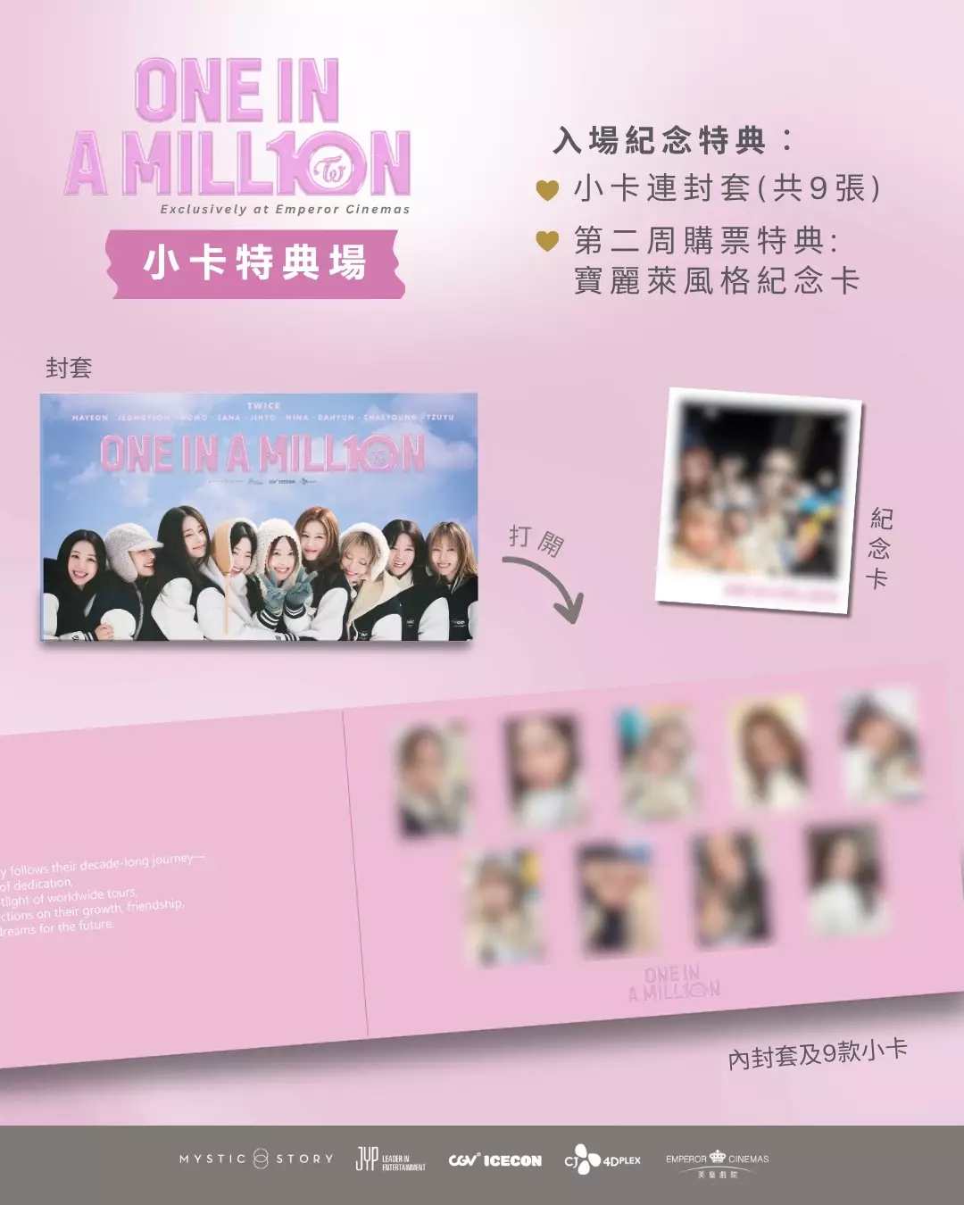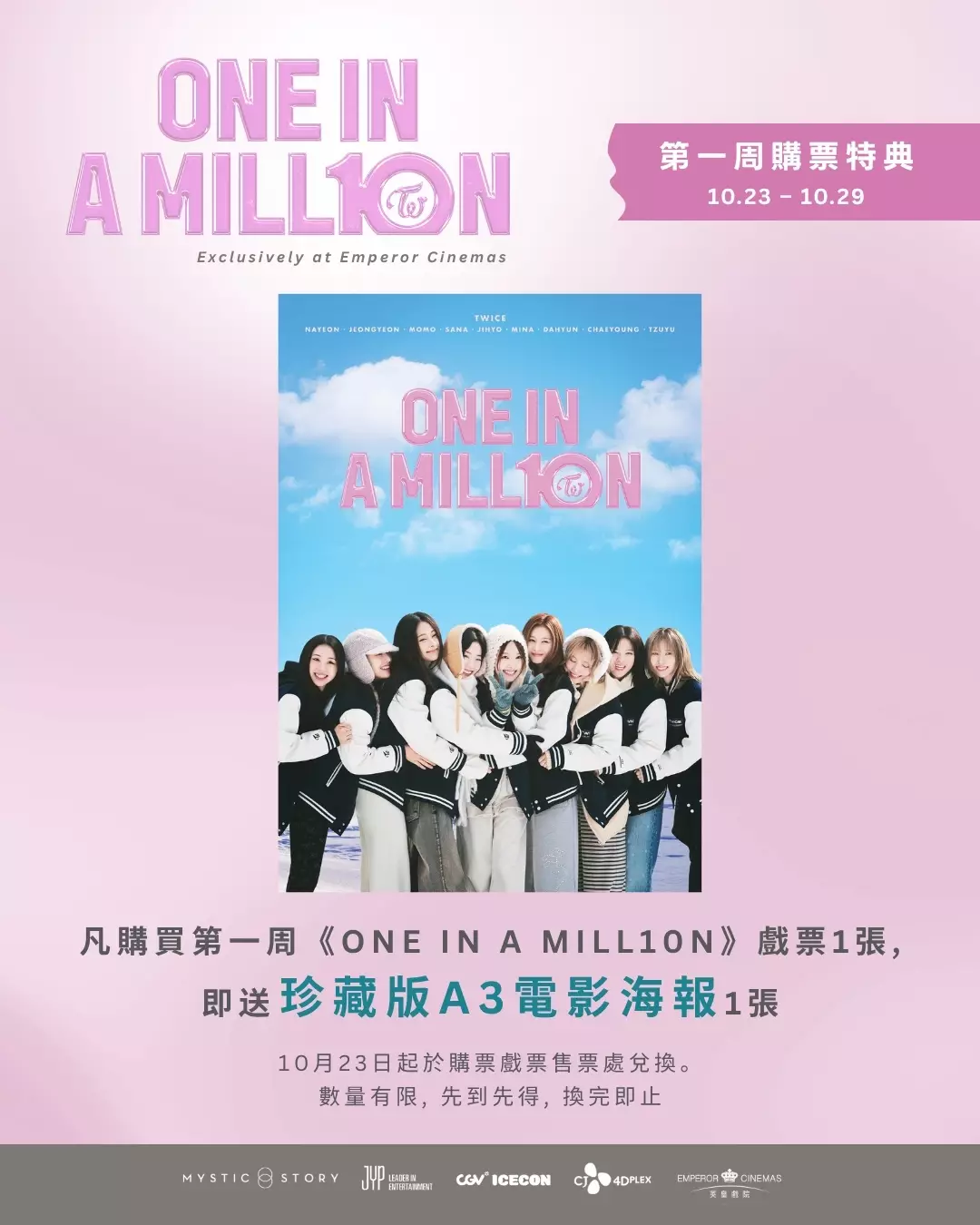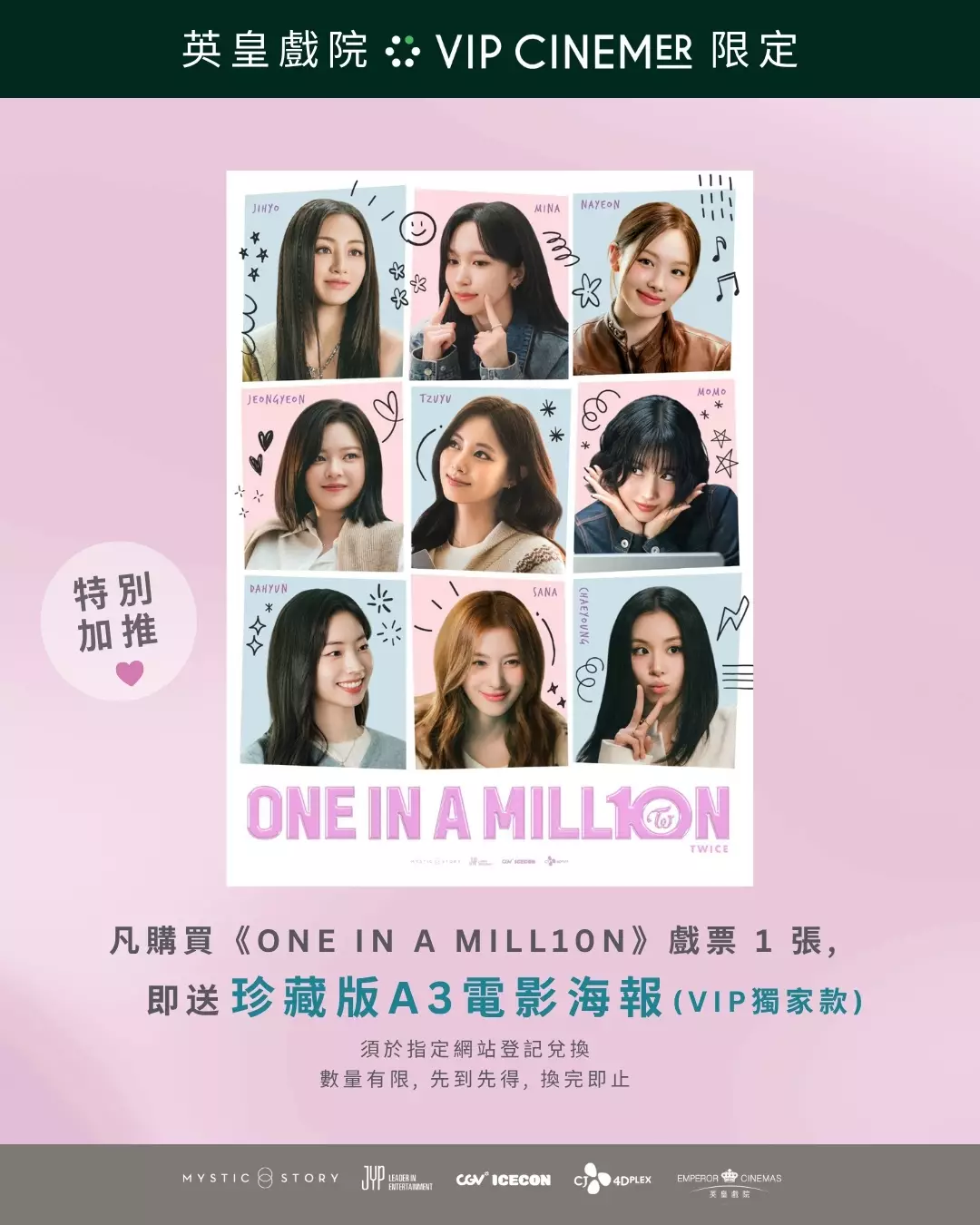 韓國現象級女團 TWICE 首部紀錄片 《ONE IN A MILL10N》將於10月23日起於英皇戲院(香港及澳門)獨家上映!影片以珍貴影像完整梳理九位成員自出道以來的十年成長,穿插練習室、巡演幕後與錄音室片段,並首次公開多段未曝光訪談與成員真誠自白,邀請觀眾在大銀幕再次感受屬於TWICE × ONCE的青春能量。