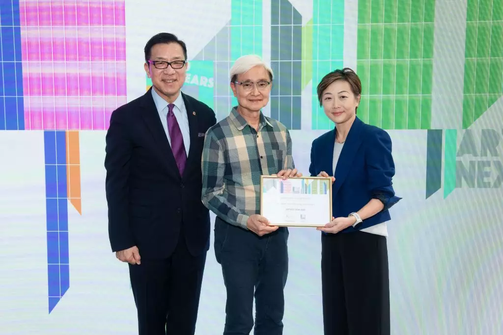 香港藝術發展局副主席 楊偉誠博士 (左), BBS, MH, JP 與培新集團地產副總監鄭韻儀(右) 頒發Wyndham Social 新銳藝術家獎予何幸兒,由著名藝術家鍾大富(中)代領。