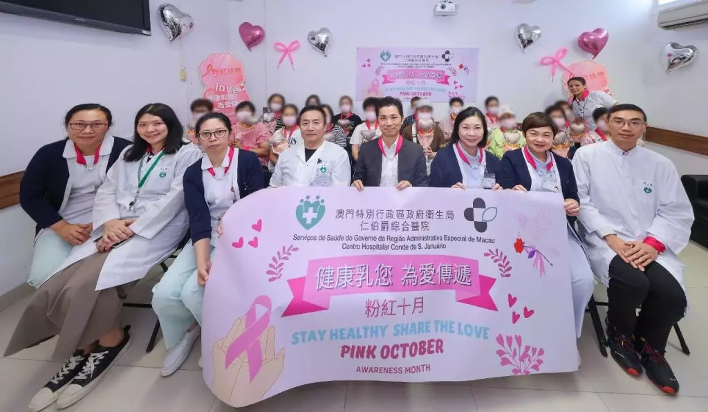 為響應每年十月的「國際乳癌關注月」(International Breast Cancer Awareness Month,又稱「粉紅十月」),衛生局仁伯爵綜合醫院日前舉辦以「健康乳您,為愛傳遞」為主題的專題講座,內容包括乳腺癌治療等,以提升患者及居民對乳癌防治的認知,鼓勵適齡女性定期接受篩查,以實現「早發現、早診斷、早治療」,是次講座包括患者及家屬等近30人出席。講座期間,醫院管理團隊與患者及家屬等一同佩戴粉色領巾,象徵全球乳癌防治的共同標誌——「粉紅絲帶」,展現醫患同心、攜手傳遞關愛與希望的信念。