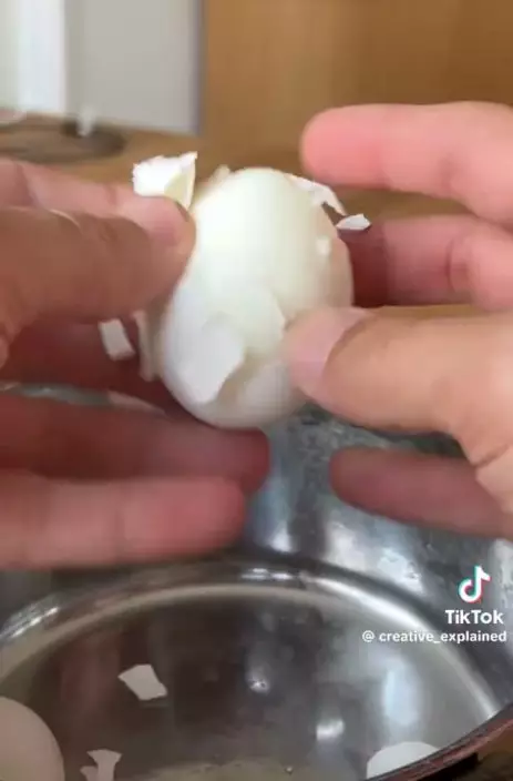 影片可見,達人示範在煮蛋水中加入約一茶匙小蘇打粉,可明顯降低剝殼難度,原理在於小蘇打能提升水的pH值,令蛋白的pH值隨之上升,進而減少與蛋殼內膜的黏附力。《Allrecipes》的烹飪專家解釋,新鮮雞蛋的pH值偏低,導致蛋白與蛋殼內膜緊密結合。隨著放置時間延長,pH值自然上升,蛋白結構略為收縮,使剝殼更容易。小蘇打粉的作用正是模擬雞蛋放置一段時間後的效果,讓新鮮雞蛋也能輕鬆脫殼。