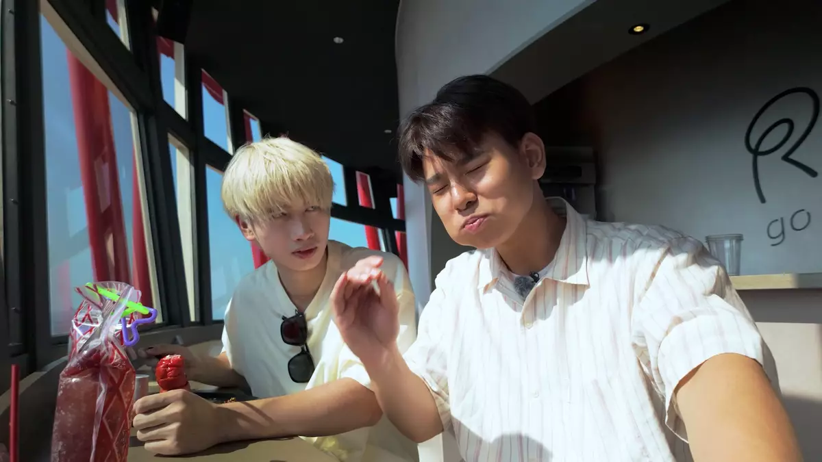 行仔「腿張開」測試旋轉餐廳的轉速。