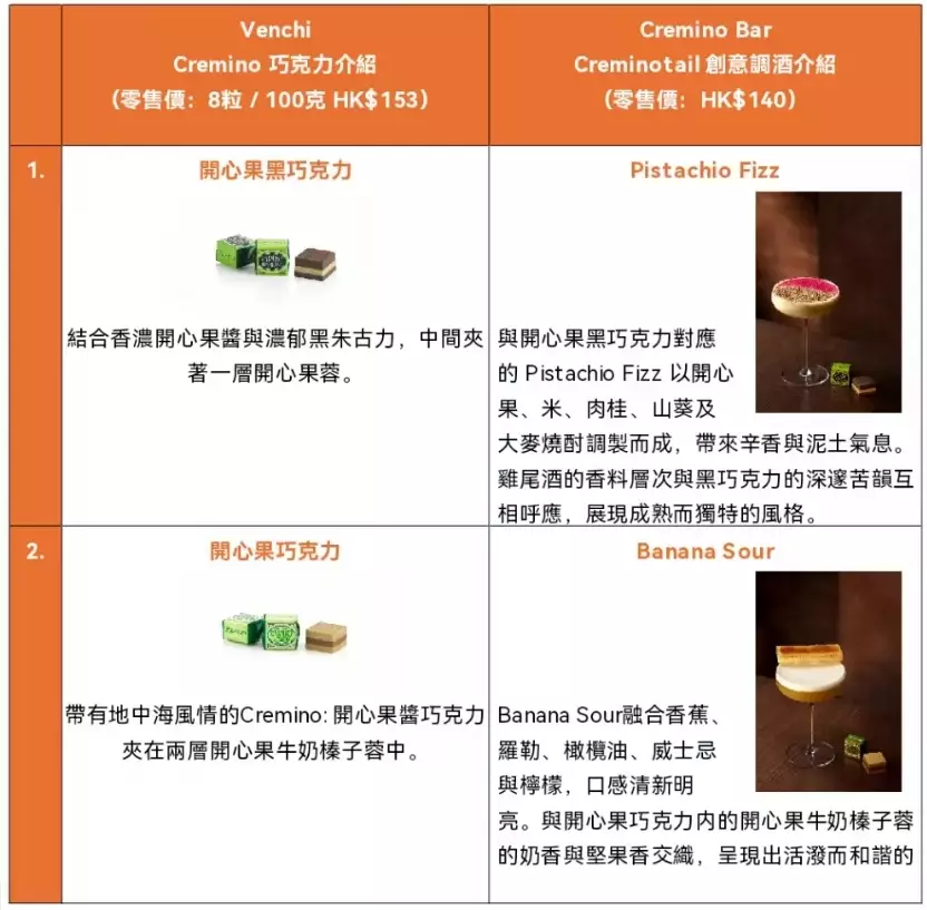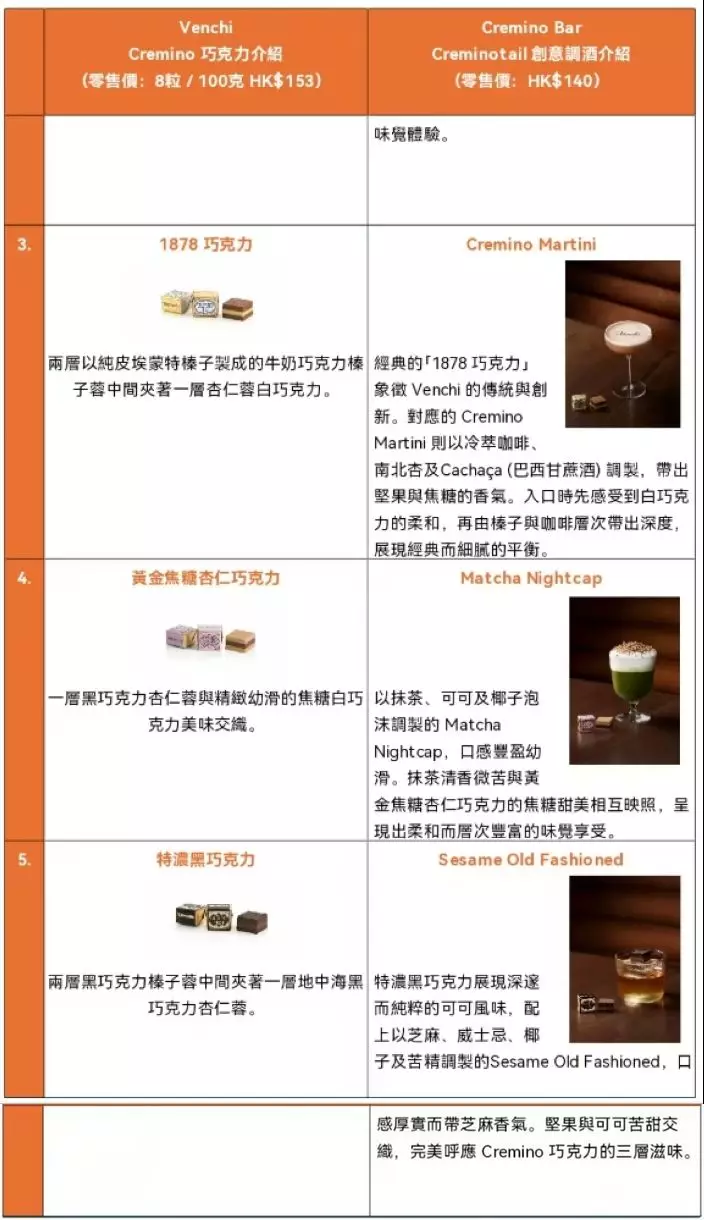 想感受巧克力和美酒之間的靈魂共振?凡於指定 Venchi 門市消費滿HK$2,000或以上(當中包含 Cremino 系列巧克力商品),即可獲贈「The Cremino Trio - 味覺篇」Drink Pass 乙張,可於4月2日至4月17日期間於 The Savory Project 酒吧免費享用指定 Creminotail 乙杯及相應的Cremino巧克力。數量有限,送完即止,想嚐鮮的您萬勿錯過。