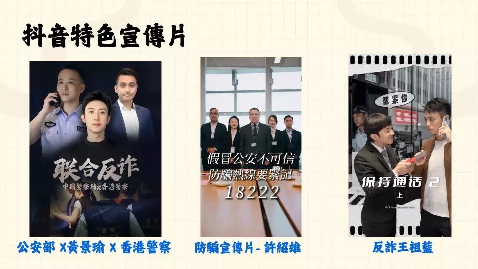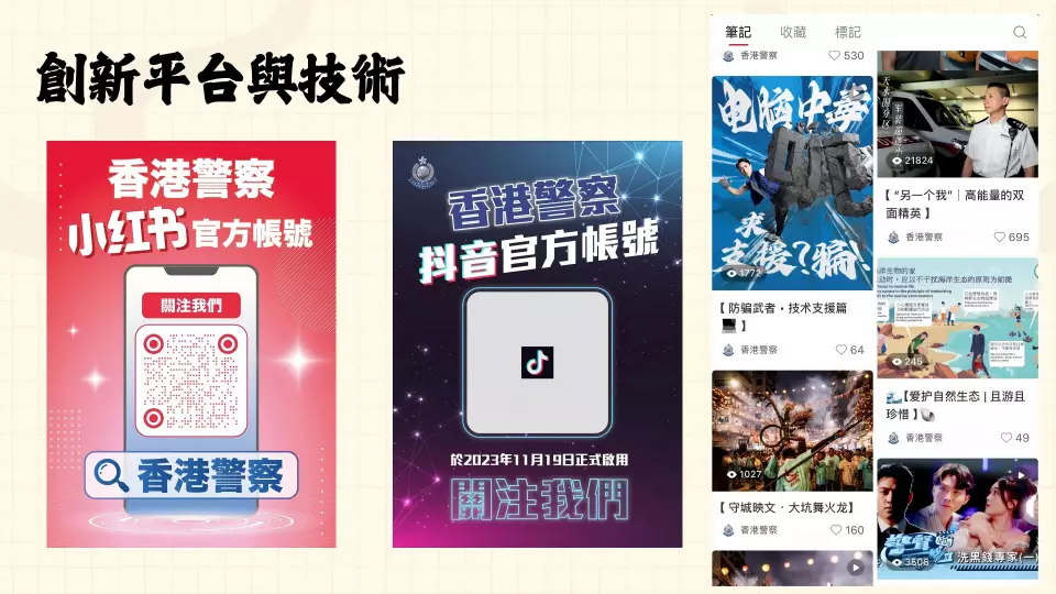 公共關係部督察陳湛森表示,警隊是首批進駐小紅書及抖音的政府部門,並因應用戶特性製作不同內容。「小紅書多女性和年輕用戶,我們會用『攻略』形式介紹防騙貼士、活動安全資訊;抖音則製作短片,與公安部、黃景瑜、許紹雄等合作拍防詐宣傳,提升傳播力。」