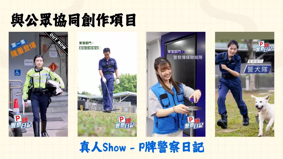 社交媒體傳訊組督察陳逸婷介紹,警隊積極與媒體及藝人合作製作節目,包括與無綫合作的《警聲百二秒》、開電視聯合推出的微短劇《郭Sir!學警A班到齊》,以及與鳳凰衛視拍攝紀錄片《香港警察故事》,以多角度展示警隊工作面貌。