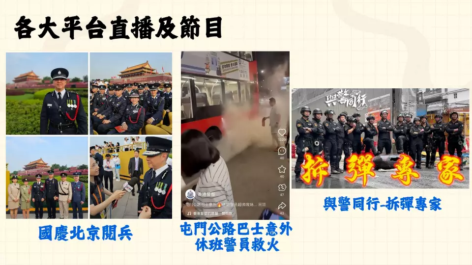 近月的多場大型活動,包括反恐演習、國慶煙花及啟德體育活動等,亦同步直播,讓市民即時了解現場情況及警隊工作流程。