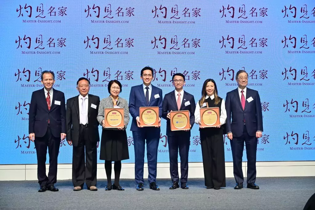 灼見名家傳媒董事局主席潘燊昌(右)、文灼非社長(左)致送紀念品予主講嘉賓楊何蓓茵(左三)、張炳良(左二)、陳家強(右三)和主持陳景祥(右二)。