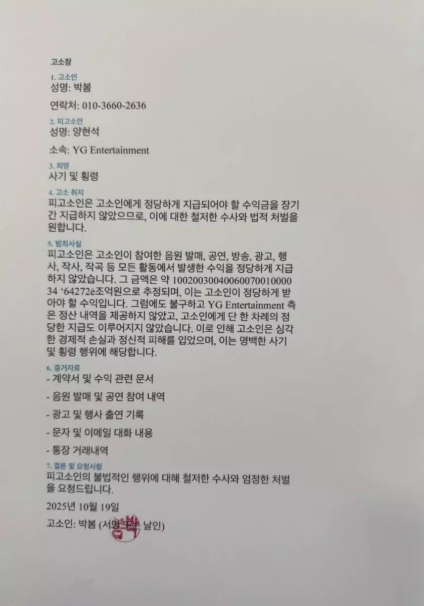 朴春日前突然公開一張訴狀,控訴YG娛樂長期未支付其應得收益,甚至貼出一張標註梁鉉錫為被告的圖片,聲稱欠款金額高達「64272e兆億韓元」,她要求對YG在任期間的所有事務進行「徹底調查及法律程序」,隨後又將照片刪走。相隔一日,朴春再爆料稱YG娛樂以她的外貌為話題進行炒作,卻從未承擔過任何整形費用,並指公司內部人員曾因拿她外貌「換取整形手術費用」而向她道歉,讓她深感羞辱。