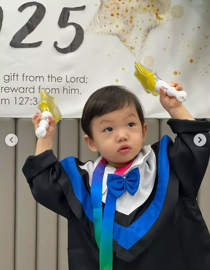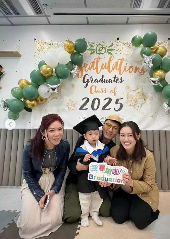 張寶兒在IG分享出席畢業禮的照片,可見2歲的袁咕碌頭戴小小畢業帽、身穿小小畢業袍,表情有點呆,但非常可愛!張寶兒見證囝囝人生第一次畢業,特別感觸良多,「雖然只是playgroup,但第一次見你畢業,爸爸媽媽還是有點觸動的。上了近兩年的課堂,我們一起見證著你從一舊飯糰,長到現在能說這麼多,多謝校長和老師的悉心教導,也多謝同學們和其他爸爸媽媽的陪伴。恭喜你,袁咕碌,準備踏入另一個人生旅程啦!#袁咕碌 #袁氏家族 #兩歲人仔的畢業禮」。