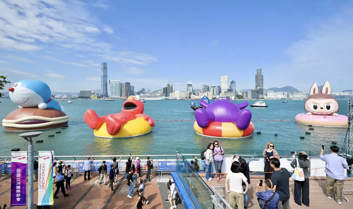 4個巨型充氣公仔包括多啦A夢、KAWS & 芝麻街(Elmo)、滑嘟嘟及LABUBU即日起在維港展出。文化體育及旅遊局局長羅淑佩稱,政府把握IP熱潮,帶來文化旅遊盛事。