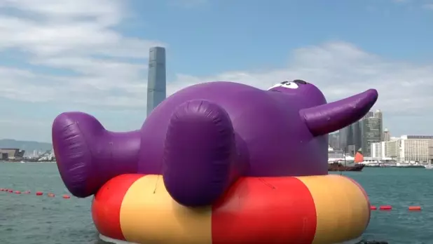 巨型充氣公仔滑嘟嘟在維港出現。(陳裕行攝)
