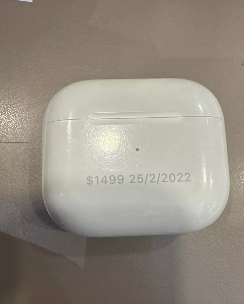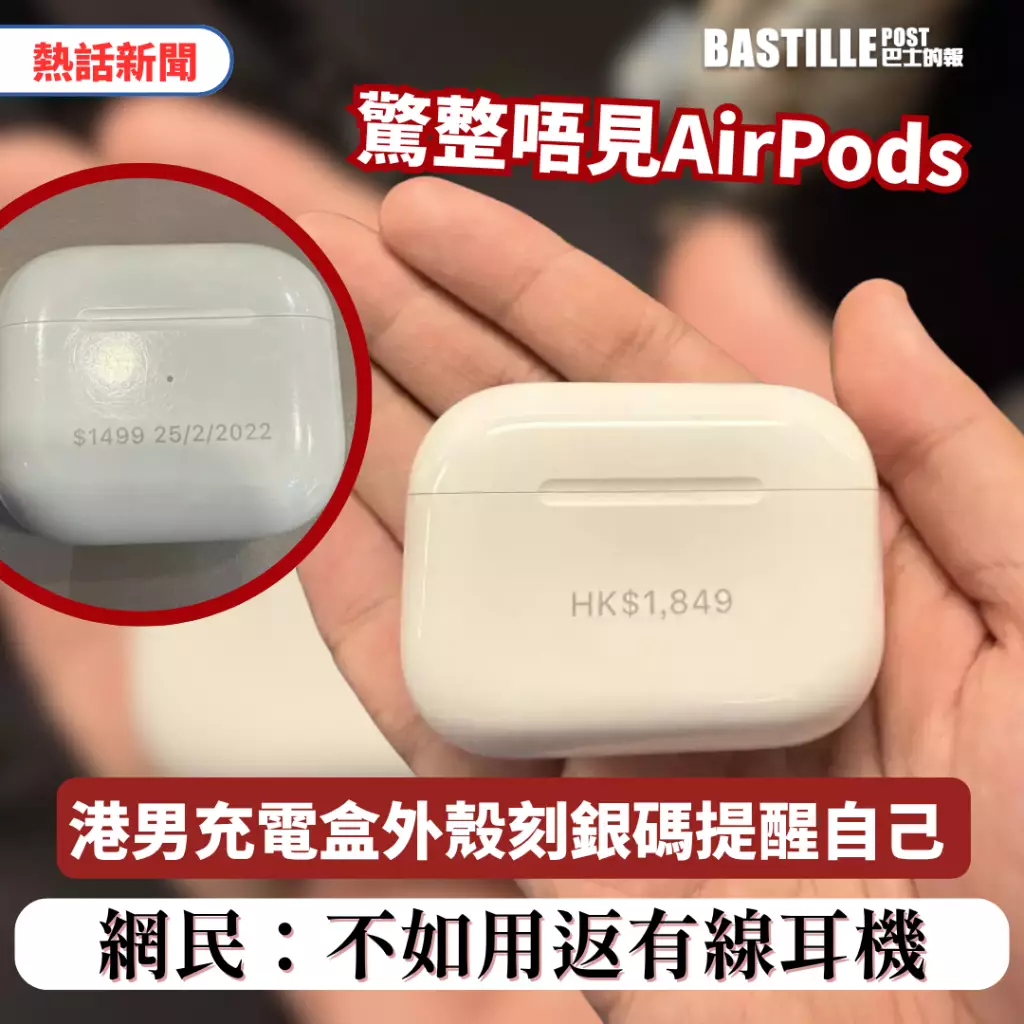 有港男在社交平台分享,為了避免弄丟價值近2000元的AirPods無線耳機,使用蘋果公司的鐫刻服務,於充電盒外層刻上耳機價錢,提醒自己千萬別弄丢。
