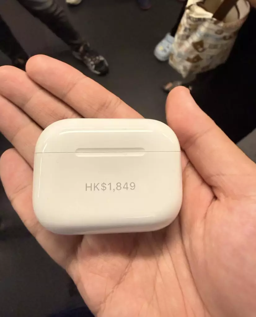 從他上傳相中所見,他使用蘋果公司網上的自訂鐫刻服務,於AirPods充電盒外殼刻上「HK$1849」,相信是購入價。