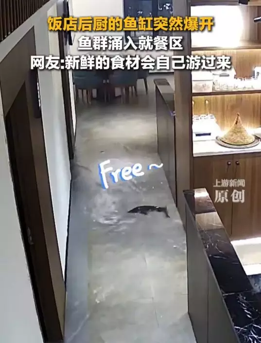 福州一間海鮮餐廳的巨型浴缸突然爆裂,活魚傾瀉而出沖入用餐區瞬變「水族館」,網民見到笑言:新鮮的食材會自己游過來!