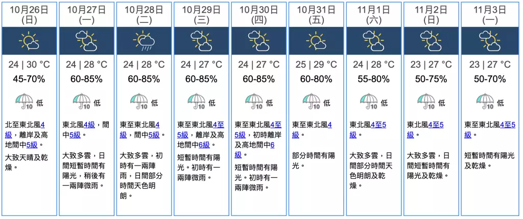 香港天文台表示,一股乾燥的東北季候風正影響廣東沿岸,預測本港地區星期日大致天晴,天氣乾燥。日間最高氣溫約30度。吹和緩北至東北風,離岸及高地風勢間中清勁。