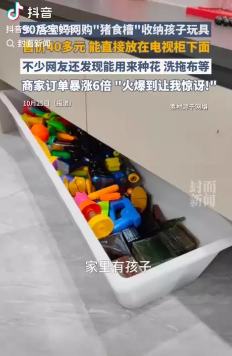 寶媽網購「豬食槽」收納孩子玩具爆紅,商家銷量暴增6倍。影片截圖