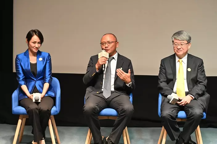 2025未來科學大獎「生命科學獎」獲獎者徐星(中)及周忠和(右)闡述其獲獎成果,包括發現了鳥類起源於恐龍的化石證據。香港中文大學醫科三年級學生劉璟龍(左)在互動交流環節擔任主持。圖片來源:未來科學大獎