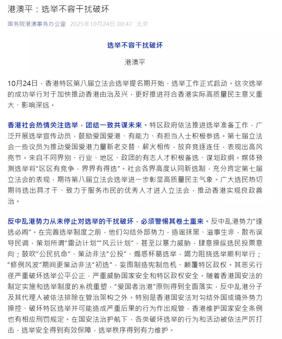 他說,任何干擾破壞立法會選舉的言論與行徑,不單違反香港的選舉法例,更觸犯香港國安法和維護國家安全條例,有關方面都會毫不手軟堅決依法打擊。