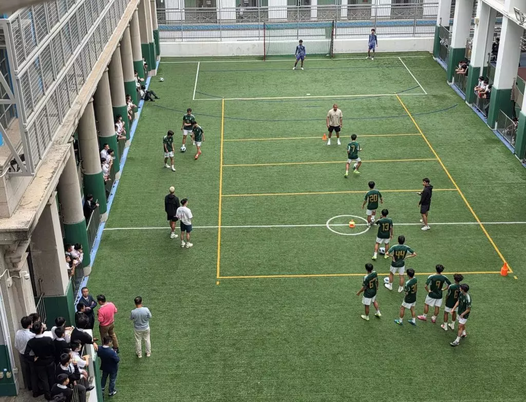 十二時半,訓練正式展開。由於活動早已在社交媒體預告,學生們早在球場兩側「霸靚位」,期待一睹英超傳奇的風采。布朗帶領球員進行射門練習,傳球至不同位置讓球員單對單挑戰守門員。接著挑戰升級,球員在半場線「射楣」,精準度要求極高,場面緊張又刺激,氣氛愈趨高漲。