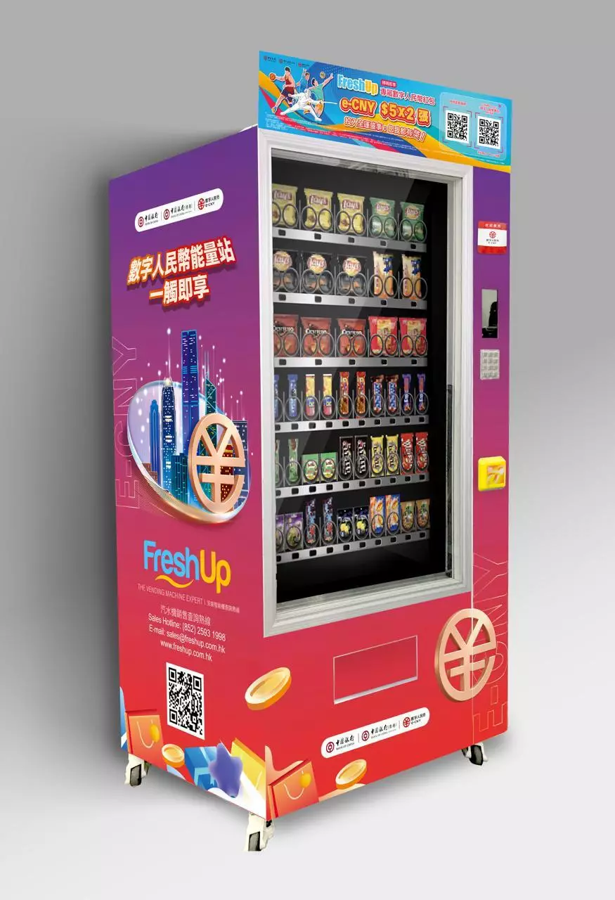 由即日起,香港首批1200部FreshUp自動售賣機正式提供數字人民幣支付服務,中銀香港將逐步拓展該服務至全線FreshUp逾4000部自動售賣機。