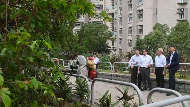 謝展寰於黃大仙鳳德邨視察地區加強預防基孔肯雅熱的工作。(政府新聞處)