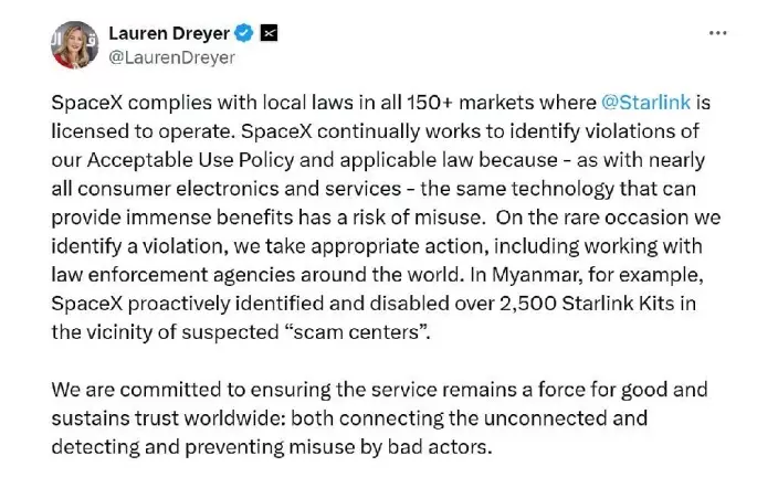 SpaceX副總裁勞倫・德雷爾(Lauren Dreyer)在社交媒體指,已在緬甸電騙園區週邊識別出超過2500台「星鏈」設備,並使其無法運作。