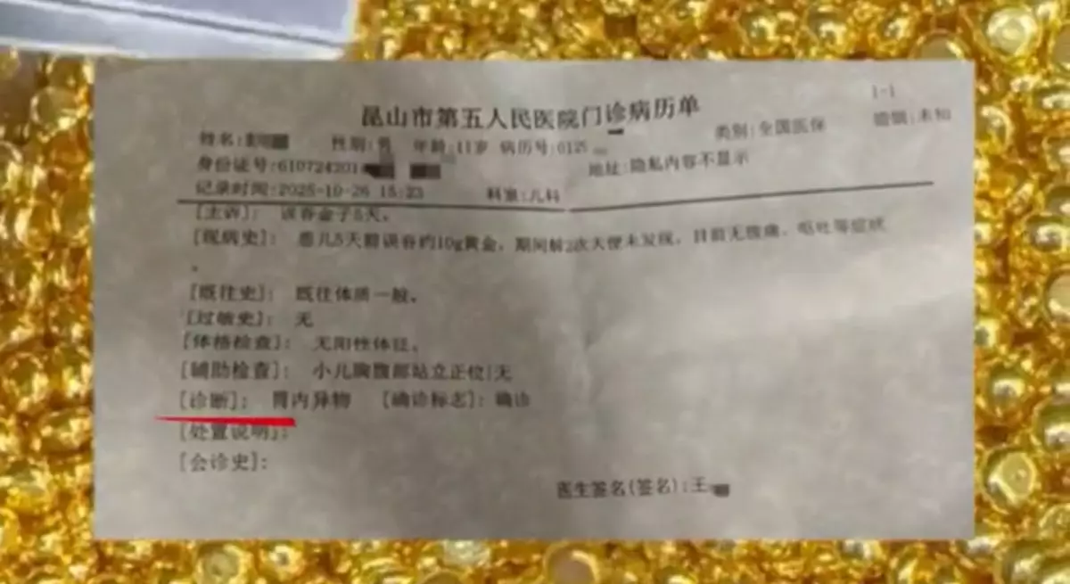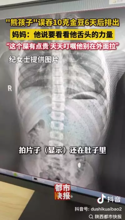 江蘇11歲男童稱「為練舌頭」誤吞價值1萬人民幣的10克金豆,令媽媽哭笑不得,叮囑他切勿在外面排便。男童排便5日均未見金豆蹤影,終於在就醫當日順利排出。
